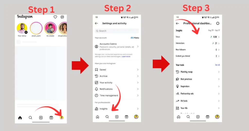 स्टेप 3: अब यहाँ पर आपको टोटल व्यूज , इनरैक्शन , न्यू फॉलोवर्स और कॉन्टेट जो अअपने शेयर कीये हैं उसके साथ कई अच्छे टूल्स देखने को मिल जायेगे।